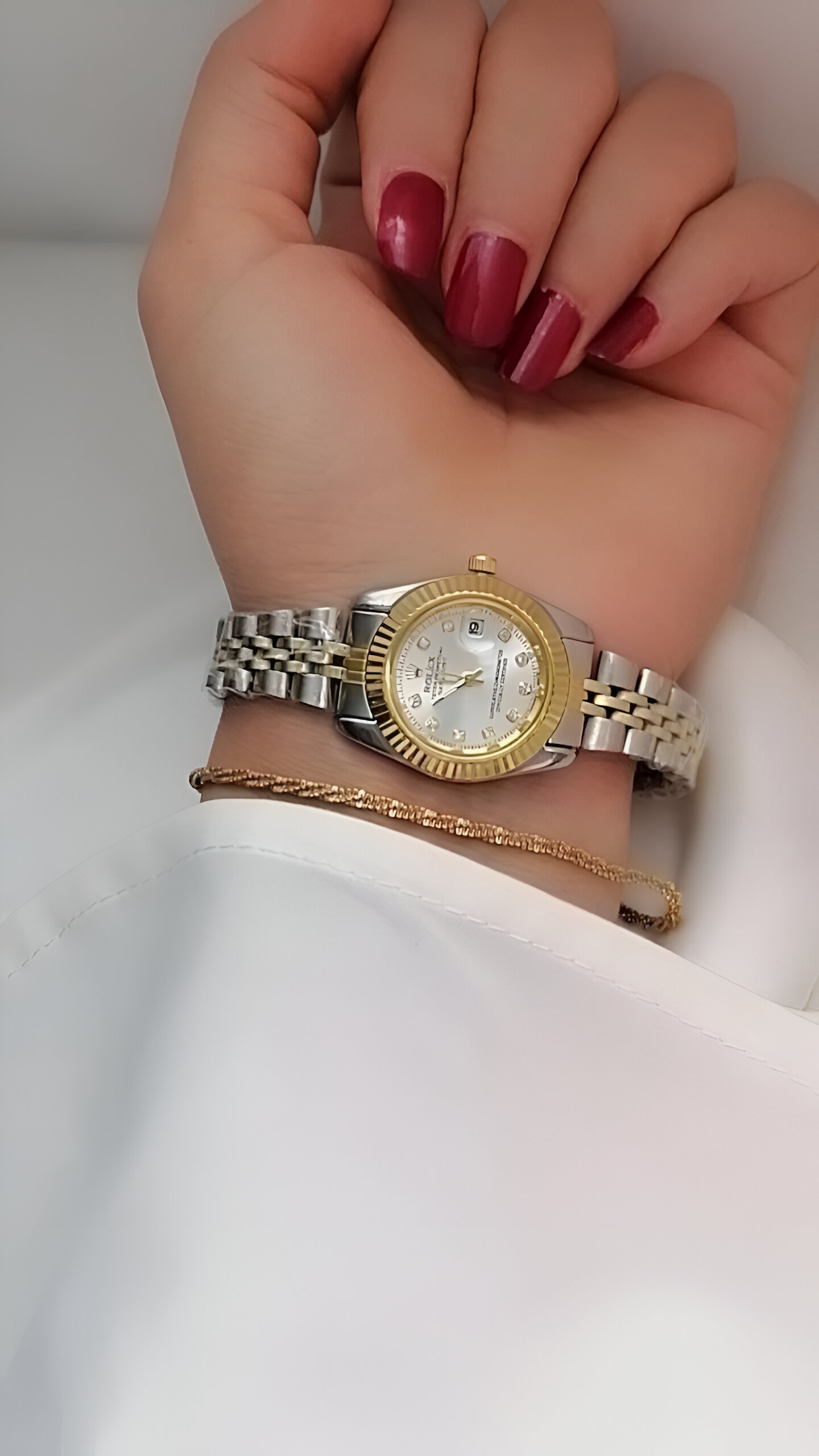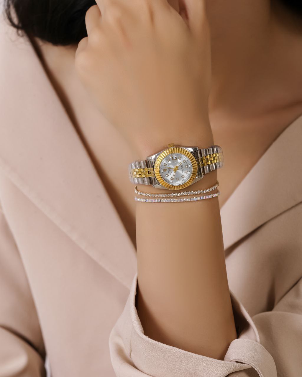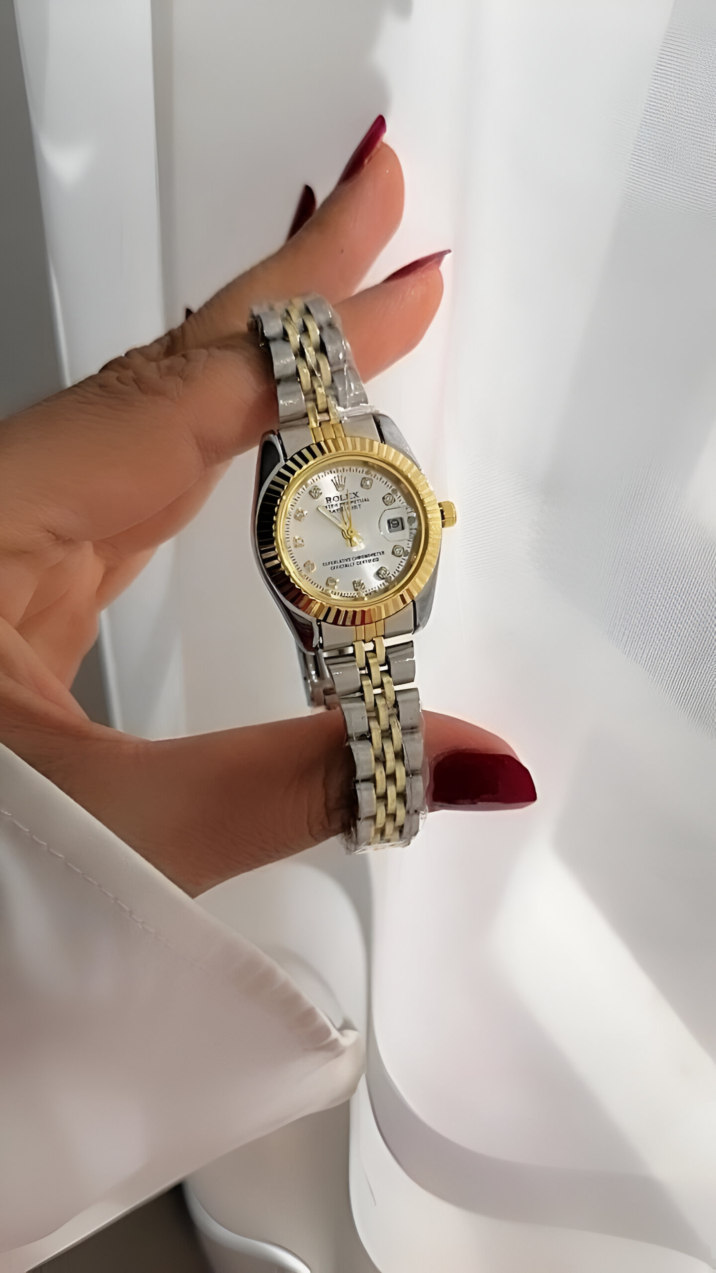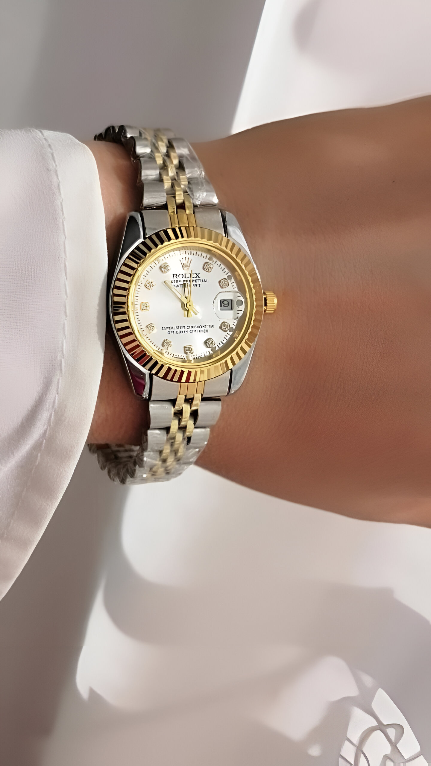 ساعت مچی زنانه رولکس صفحه صدفی بند دو رنگ طلایی و نقره ای، دور صفحه طلایی قطر صفحه 25 میلی متر ساعت پرفروش ضد آب در حد شستن دست ها تاریخ دار فعال