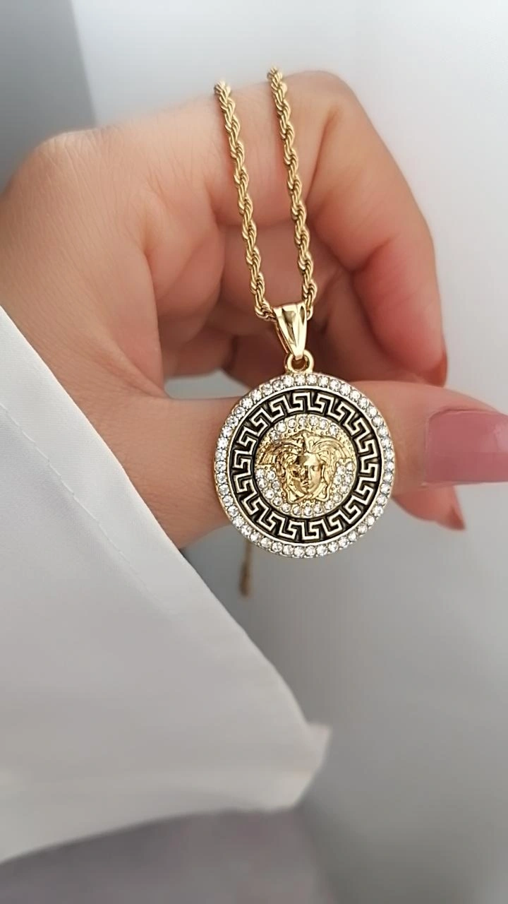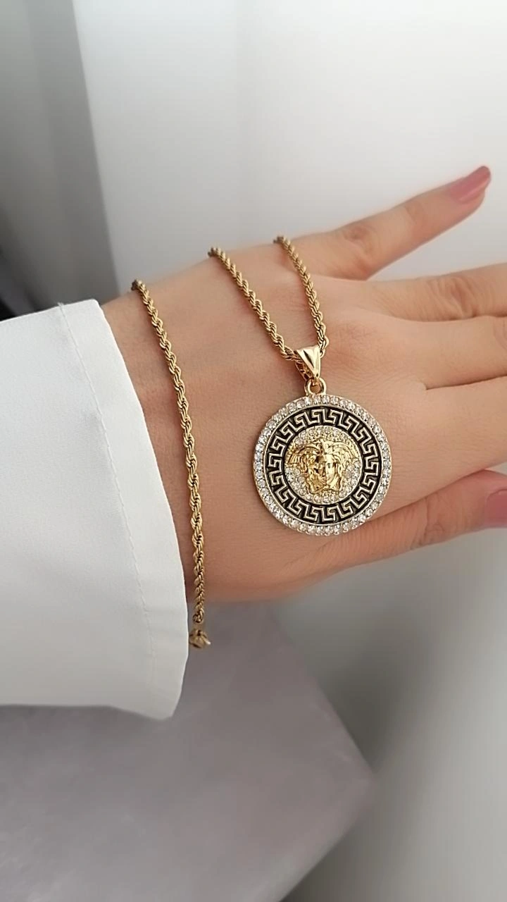 پلاک رنگ ثابت تمام نگین و پردرخشش ورساچه با نگین های مخراج کاری شده و رنگ ثابت طول پلاک ۳ سانتی میتونید همراه زنجیر هم سفارش بدین
