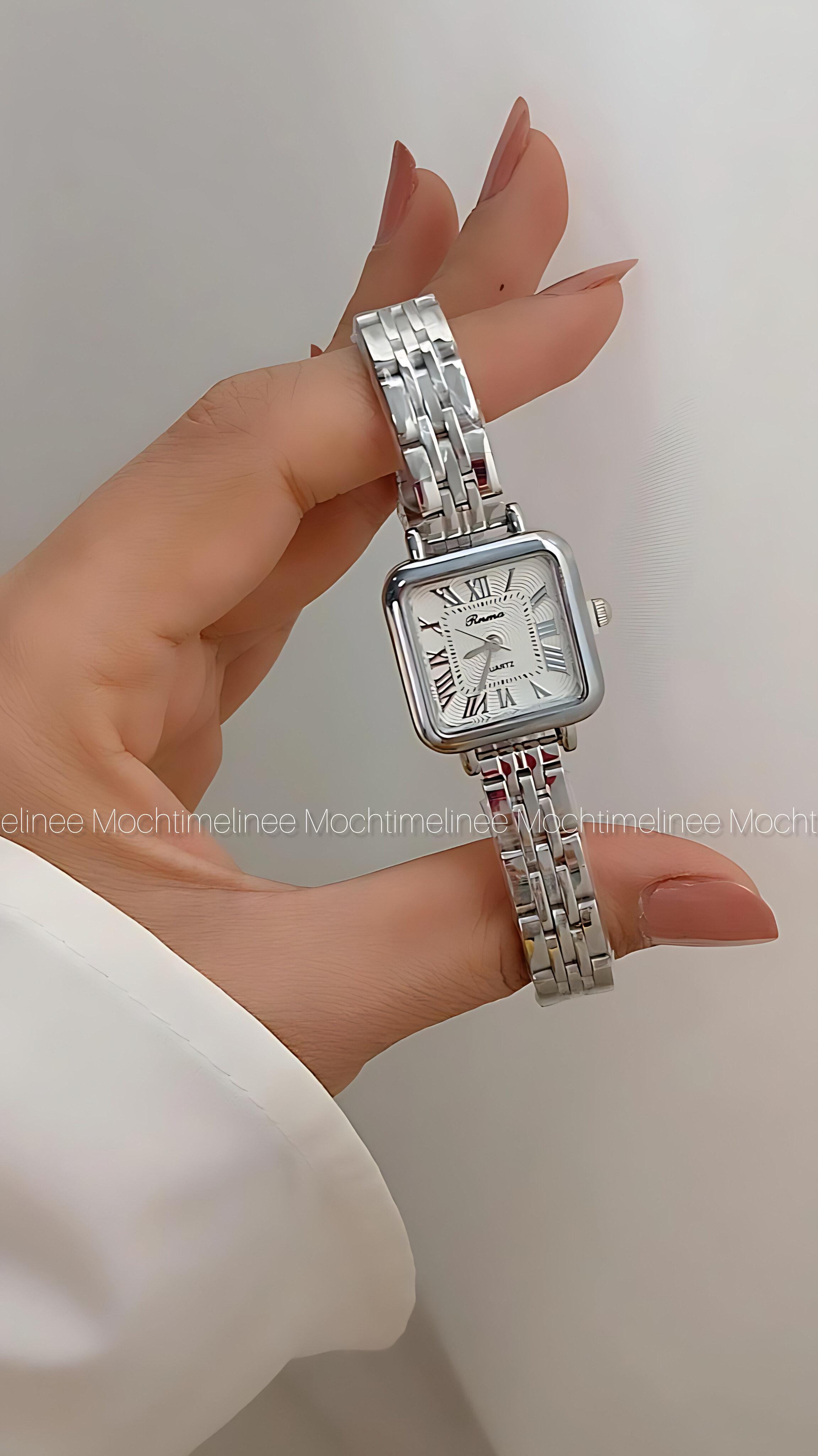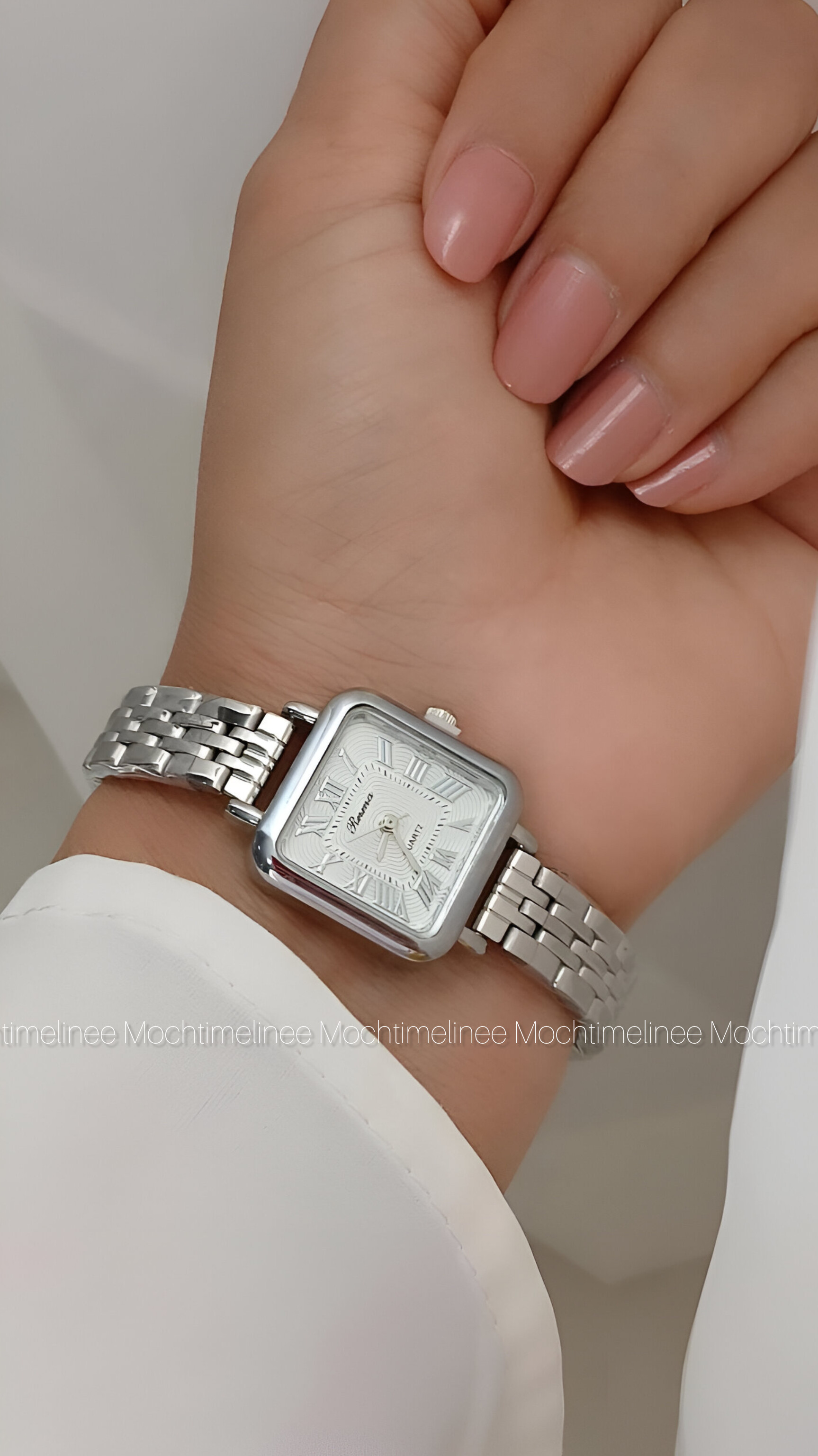 ساعت صفحه مربعی RANMA بک و بند استیل صفحه صدفی طرح دار اعداد یونانی قفل کلیپسی ضامن دار بسیار خوش دست رنگ ثابت و ضد آب