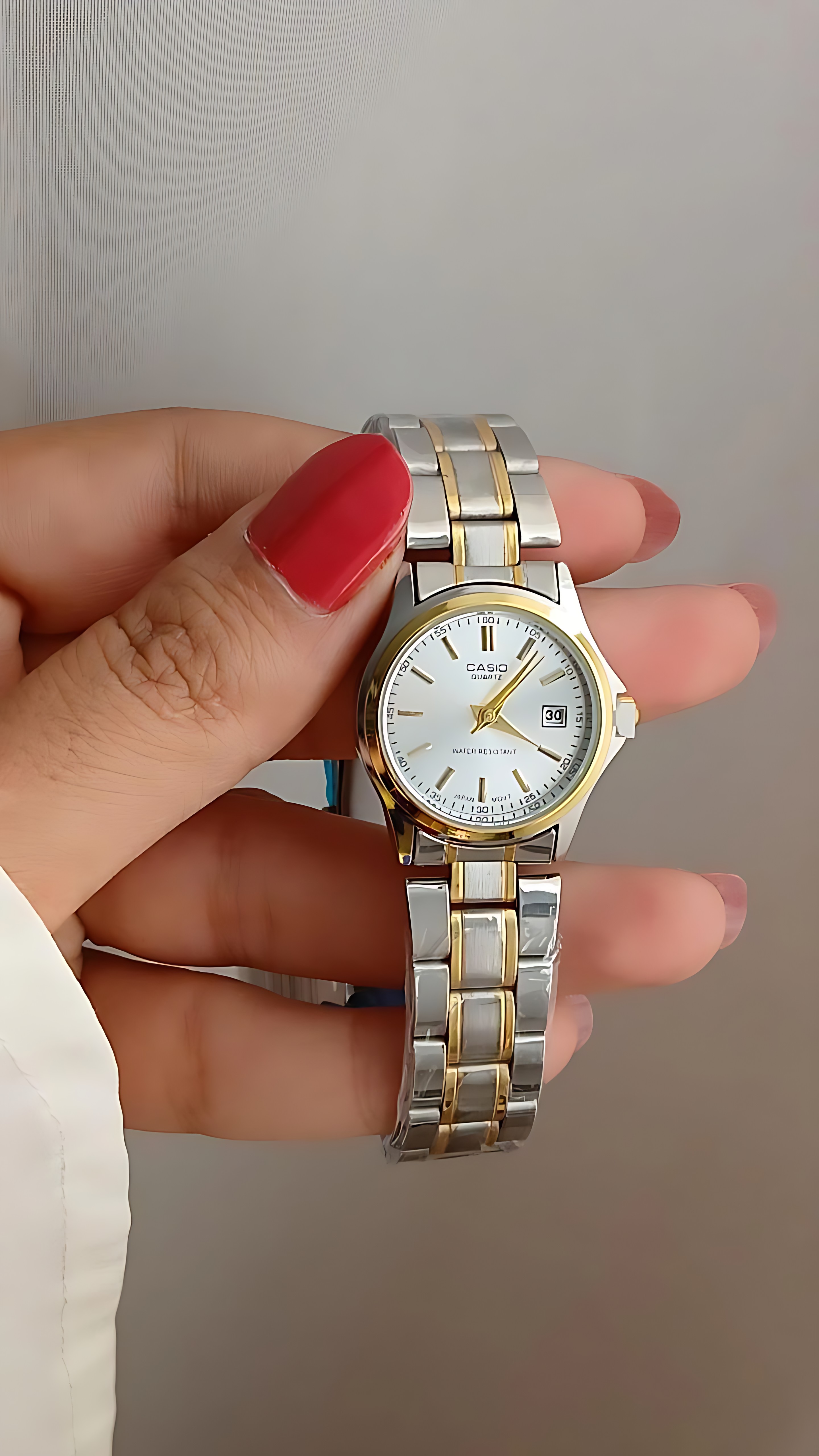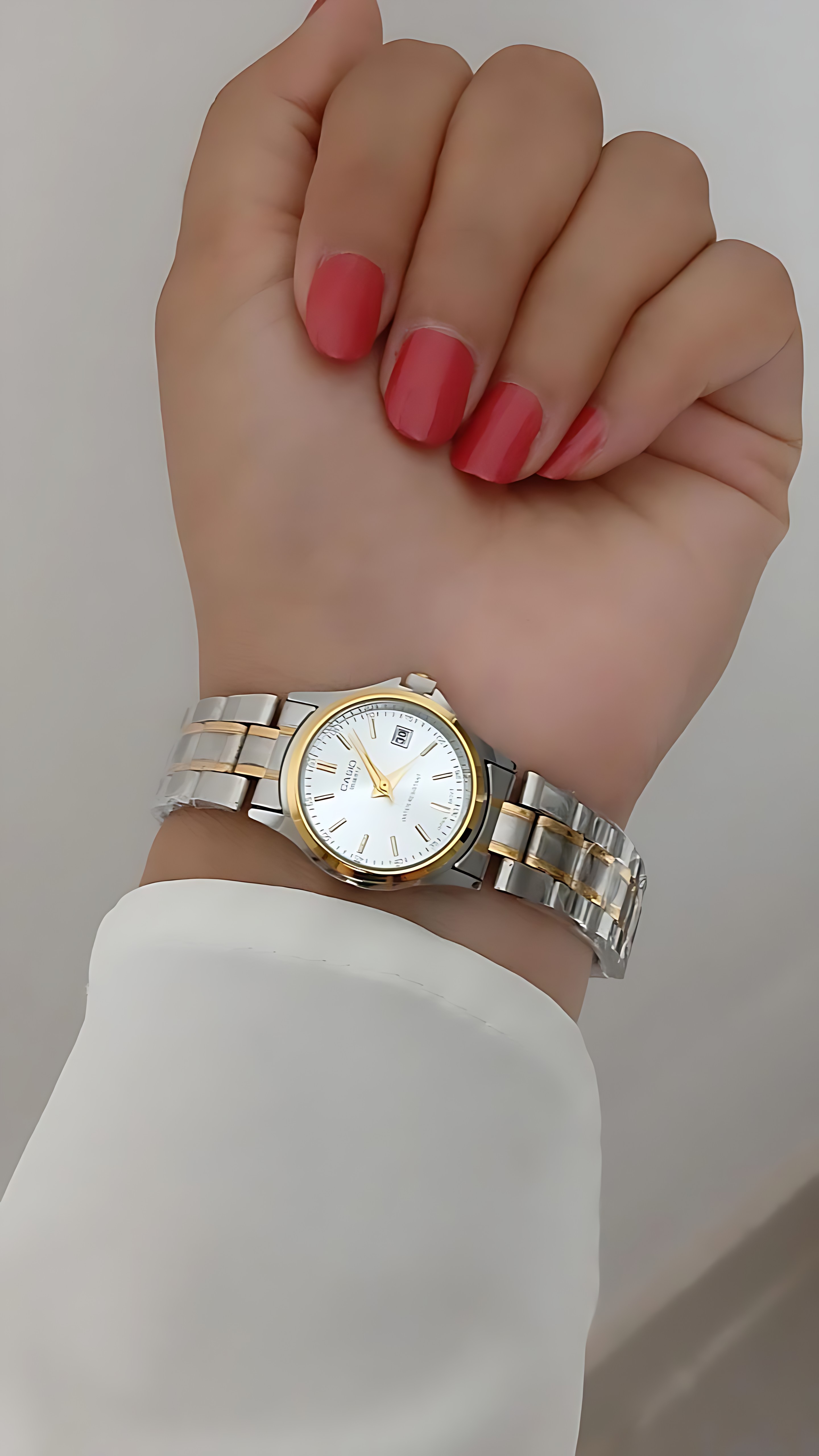 ساعتمچی زنانه کاسیو با بند قابل تنظیم موتور کوارتز تاریخ دار فعال با حک برند کاسیو روی قفل شیشه معدنی و باتری قابل تعویض بند تمام استیل شیشه معدنی